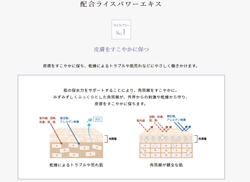 ライスパワーNO.1の効果は、角質層に直接働きかけて、みずみずしいしっとり感を保ちます。